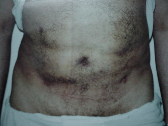 Abdominal and flank liposuction:This 51-year old man had circumferential lipocontouring using a combination of Vaser and Laser 4D liposuction. A total of 3000 ccs of fat was removed from his abdomen and love handles.